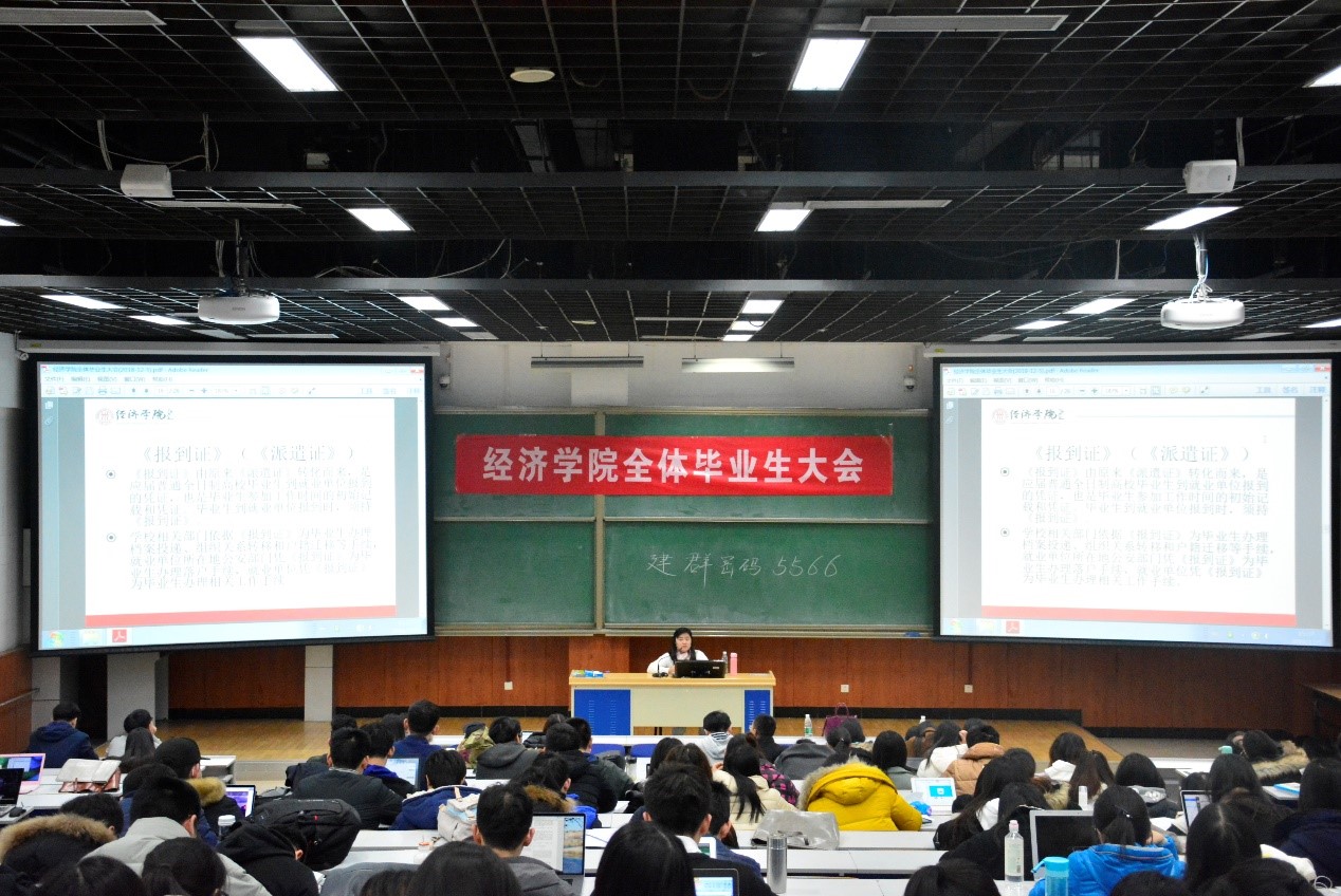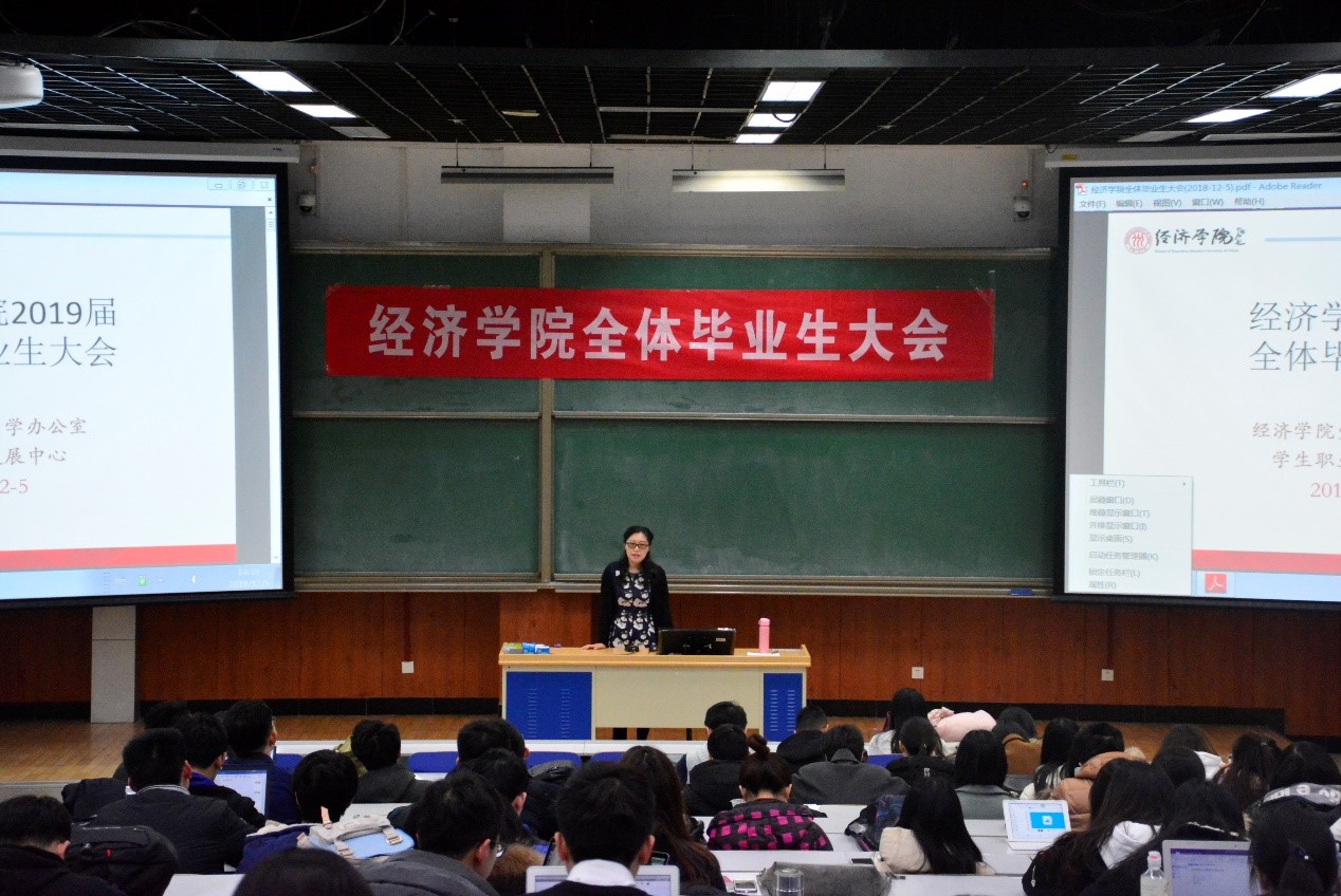 随后,学生职业发展中心主任撒莉老师为同学们详细讲解了就业相关事项。撒莉老师播放了学院精心制作的动员视频,就职于在不同岗位的校友们和学院的领导、老师们向毕业生传达了“经院一家人”、“我们和你在一起”、“一起加油!”的支持和祝愿,在场同学看后大受鼓励和感动,反响热烈。在就业形势一年比一年严峻的同时,经院毕业生在2018、2017年就业率均为100%,在全校中排名前列,学生总体就业质量良好。撒莉老师为同学们一一讲解了就业信息来源的获取、就业信息网的使用、就业推荐表的填写、就业协议和劳动合同的签订流程,以及报到证的用途等相关事项,倡导大家乐观看待求职,树立“先就业后择业”的就业观,顺利渡过求职季,做到学业与事业的双丰收。