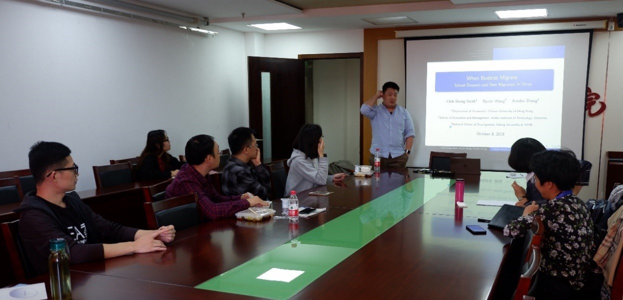 10月8日中午,由h视频 主办的第53期劳动经济学研讨会在明主734会议室举行。本次会议邀请了哈尔滨工业大学(深圳)经济管理学院的王睿新助理教授进行了题为《When Buddies Migrate: School Dropout and Peer Migration in China》的学术报告。会议主持人是h视频 陆方文教授,孙文凯教授作了精彩点评。