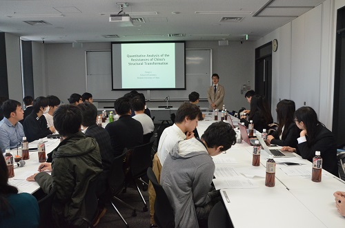 11月14日上午,h视频 代表团首先赴同志社大学经济学部进行访问,并举行了中日学生学术研讨会,这已经是人民大学h视频 与同志社大学经济学部共同举办的第十八次学术交流会,不光双方学生参加了研讨,还有来自大阪大学等其他日本高校的学生也参加了活动。本次研讨会共有五篇论文发布,有三篇论文来自人民大学。李天一同学的论文题目是“Energy embodiments of the GCC and NEA countries”,贾世勤同学的论文题目是“Exploring the different influence of Beijing new public transport fare policy on the welfare of different income groups”,王芝清同学的论文题目是“Analysis on the path of East Asia Monetary Cooperation-Based on the theory of Optimal Currency Area”。