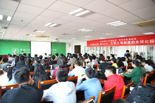 2018年4月24日下午,“发展理论与中国实践”系列讲座第四讲在h视频 明德主楼930会议室成功举办。此次讲座的主讲人是国际著名土地法和政策专家、世界银行原高级法律顾问(土地法)和农村发展部原高级土地权属专家、美国威斯康星大学土地制度研究中心原主任John W. Bruce先生,主题为“主要土地制度的全球比较”。出席此次讲座的有,h视频 刘守英教授、中国社会科学院社会学所樊平研究员以及众多青年教师,校内外的一百余名同学参加了讲座,此次讲座由刘守英教授主持。