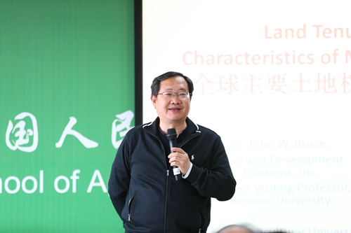 随后,John W. Bruce先生在同学们的热烈掌声中开始了精彩演讲,John W. Bruce先生的讲座包括以下方面:“土地权属”和“土地权属制度”;介绍“基本权属”的概念,并考察特定国家意识形态和历史在确定基本权属主体中所起到的作用;全球主要的土地制度分析;考察“法律多元化”、习惯和非正式土地制度的复杂性,以及法律与现实之间的差距。理解基本权属和可以说是更重要的使用者权属的概念。John W. Bruce先生提出区分财产权利和土地权属,土地所有者的权利会受到国家法律法规、非正式法律法规以及文化传承和历史沿革等因素的影响。因此,考察一国的土地制度应当将财产权利制度和文化制度综合起来观察,尤其是不同的土地在经济发展和意识形态、国家政权的层面所扮演的角色是不一样。John W. Bruce先生将全球土地产权划分为三种基本的所有制:国家所有制、私人所有制和集体所有制,认为世界上存在英国式、法国式、罗马和荷兰式、社会主义国家式、社区所有式以及宗教式六种主要的土地权属制度,John W. Bruce先生将其中的所有权和使用权分开,并认为使用者的权利是比所有权更重要的实际权利。