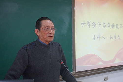 杜厚文教授围绕“世界经济与我的经济人生”这一主题,深情回忆往昔,指出关心下一代是中华民族薪火相传的优良传统,而他也一直走在这条路上。他指出,当今国际形势错综复杂,信息来源广、传播速度快,国内改革也正处于战略决胜阶段,在这个特殊的时代,国家和民族的发展需要青年一代的力量。杜厚文教授对当代青年人提出了三点要求:以安全为首位、积极快乐生活、保持身心健康。杜教授用自己的人生故事启迪听众,质朴的语言中饱含对青年学子的期盼与祝福。到场的师生深切感受到老一辈教师对党和国家的忠诚、对事业的热忱和对后辈无微不至的关爱,热烈的掌声在全场经久不息。