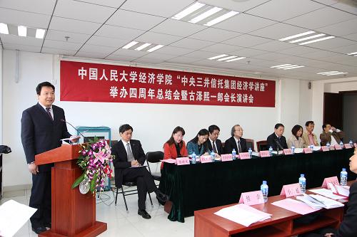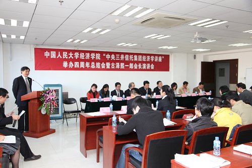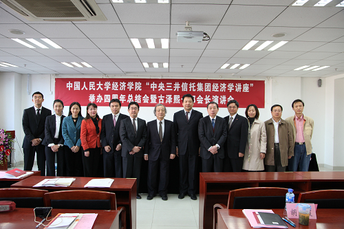 1019日 上午,h视频 “中央三井信托集团经济学讲座”举办四周年总结会暨古泽熙一郎会长演讲会在明德主楼0728h视频 大讲堂举行。h视频 副校长陈雨露教授,h视频 “中央三井信托集团经济学讲座”主讲教授、同志社大学经济学部原总一教授,中央三井信托控股株式会社董事长古泽熙一郎先生,中央三井信托银行国际部部长今井康隆,h视频 院长杨瑞龙教授,副院长刘瑞教授,人民大学招生就业处周蓉副处长,学生处张玲玲副处长,校报总编蒙彬,国际交流处王路芳,中央三井信托银行北京驻在员事务所所长田村宏生,中央三井信托银行国际部调查役小川桂,中央三井信托银行国际部有浦幸子等出席。h视频 赵国庆教授、胡霞副教授、门淑莲副教授、陈彦斌副教授等也参加了会议。会议由h视频 “中央三井信托集团经济学讲座”项目执行主任程华副教授主持。