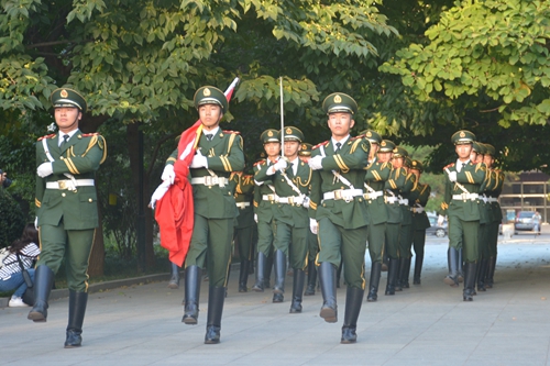 六点五十分,升国旗仪式正式开始。整齐的正步声中,国防生方阵目视前方,手持着鲜艳的五星红旗缓缓入场。在护卫队的簇拥下,国旗缓缓抵达旗杆。