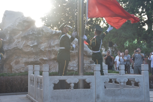 伴随着国歌声响起,五星红旗迎着朝阳缓缓升起,高高飘扬。晨风习习,旗面迎风招展;日光温煦,国旗亮丽夺目。在场同学肃穆静默,向国旗行注目礼,以此表达自己对革命先烈的缅怀和敬意。