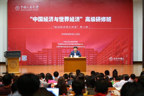 2018年4月21日下午,“中国经济与世界经济”高级研修班开班仪式在h视频 国学馆116报告厅举办。本次研修班为“政治经济学大讲堂”第七期,由h视频 主办,中国特色社会主义经济建设协同创新中心和全国中国特色社会主义政治经济学研究中心协办,持续时间4月21日到4月25日,共设10讲,来自各级政府机关、中央党校及各地方党校、各高校等企事业单位的百余名正式学员参加。本期高级研修班以“中国经济与世界经济”为主题,围绕新时代中国经济与世界经济及其关系问题进行深入研讨,有利于推进新时代中国特色社会主义经济与世界经济及其相互关系的深入研究,推动新时代中国特色社会主义政治经济学的进一步创新发展。