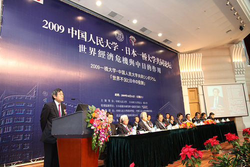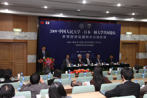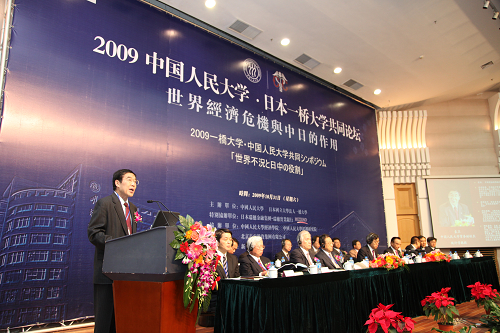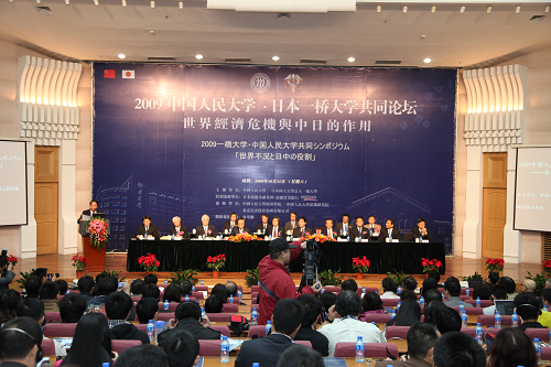 1031日 ,由h视频 、日本一桥大学联合主办,瑞穗金融集团特别协办,h视频 、h视频 深圳研究院、北京长安投资集团有限公司共同协办的“2009h视频 ·日本一桥大学共同论坛——世界经济危机与中日的作用”在人民大学逸夫会堂举行。h视频 常务副校长袁卫教授,日本国立大学法人一桥大学副校长山内进教授,瑞穗实业银行执行董事、中国营业推进部中泽幸太郎部长等出席论坛并致辞。国家开发银行顾问、全国政协委员刘克崮,国家外汇管理局副局长王小奕、国务院发展研究中心社会发展研究部副部长林家彬等领导出席了论坛。中日双方10余名学者在论坛上发表学术演讲。论坛由h视频 深圳研究院院长 陈建教授和一桥大学大学院商学研究科三隅 隆司教授共同主持。