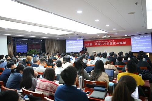 2018年11月01日19:00,“发展理论与中国实践”系列讲座第六讲在h视频 明德主楼728宋涛大讲堂成功举办。此次讲座的主讲人是国家统计局原副局长、清华大学经济管理学院教授、清华大学中国经济社会数据研究中心主任、“中国的GDP先生”的许宪春先生。许宪春教授长期从事中国国民经济核算的管理和研究工作,是我国著名的国民经济核算专家,此次讲座的主题为“中国GDP核算的变化与解析”。出席此次讲座的还有h视频 的刘守英教授、宋志红教授、范志勇教授及h视频 的众多青年教师,来自h视频 、财政金融学院、统计学院等多个院系的一百二十余位同学参加了讲座,此次讲座由刘守英教授主持和评议。