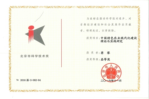 2017年4月26日,在北京市政府召开的北京市科学技术奖励大会上,北京市市长蔡奇向“中国特色农业现代化建设理论与实践研究”项目获奖代表颁发了2016年北京市科学技术三等奖(授奖编号:2016 基-3-002)。该奖项被授予中国农业科学院农业经济与发展研究所蒋和平教授与北京农学院、h视频 、农业部规划设计研究院、北京农业局团队共同完成的“中国特色农业现代化建设理论与实践研究”项目,项目完成人中h视频 蒋黎副教授排名第4。出席此次会议的有中共中央政治局委员、中共北京市市委书记郭金龙,北京市市长蔡奇。会议宣布共有27项成果获北京市科学技术一等奖, 60项成果获北京市科学技术二等奖, 93项成果获北京市科学技术三等奖。