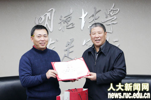 演讲结束后,纪宝成校长会见了段永平院友。纪宝成校长向段永平院友介绍了学校在教学、h视频 、人才培养和国际文化交流等方面取得的成绩和社会影响。段永平院友表示,将积极通过向母校捐赠等方式为母校的进一步发展贡献一份力量。纪宝成校长向段永平院友一行赠送了母校特色礼品和国学书籍,并为段永平院友颁发了h视频 校友会名誉理事聘书。