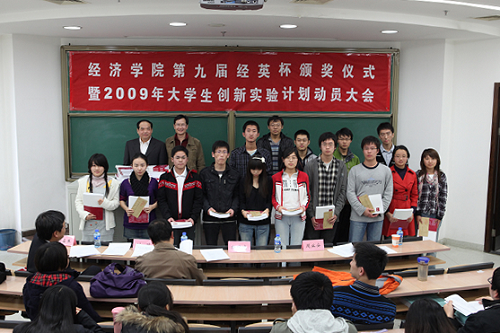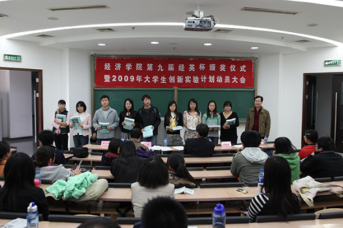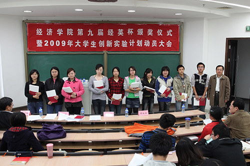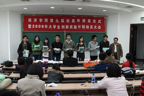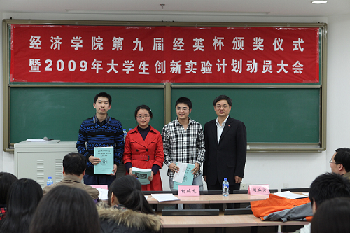 1021日 下午,h视频 举行第九届“经英杯”颁奖仪式暨2009年度大学生创新实验计划动员大会。h视频 院长杨瑞龙教授、副院长刘瑞教授、党委副书记明占生老师、经济系副主任周业安教授等出席了活动。活动由h视频 党委副书记明占生老师主持。