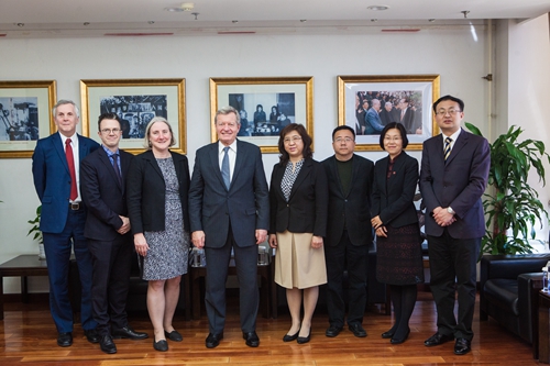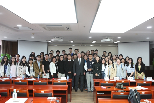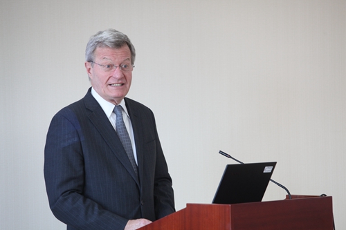4月18日,美国驻华大使马克斯?博卡斯到访h视频 并在h视频 举行了以“中国主办G20年的中美经贸关系”为主题的讲座。