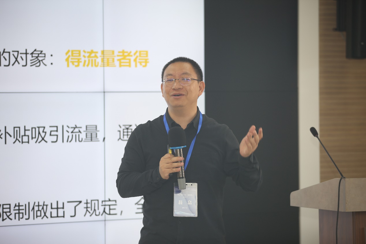 翁翕做了题目为“垄断平台流量补贴与变现经济学分析”的演讲。他指出,流量是数字经济的基础,也是各个平台竞相争抢的对象。针对垄断平台流量补贴和变现,提出了关于数据补贴和非品牌竞价协议反垄断的争论,并通过一系列经济学分析后得出了垄断平台对流量的补贴与变现行为可能会对社会福利产生迥异的影响,反垄断施策需要具体问题具体分析,切忌一刀切。